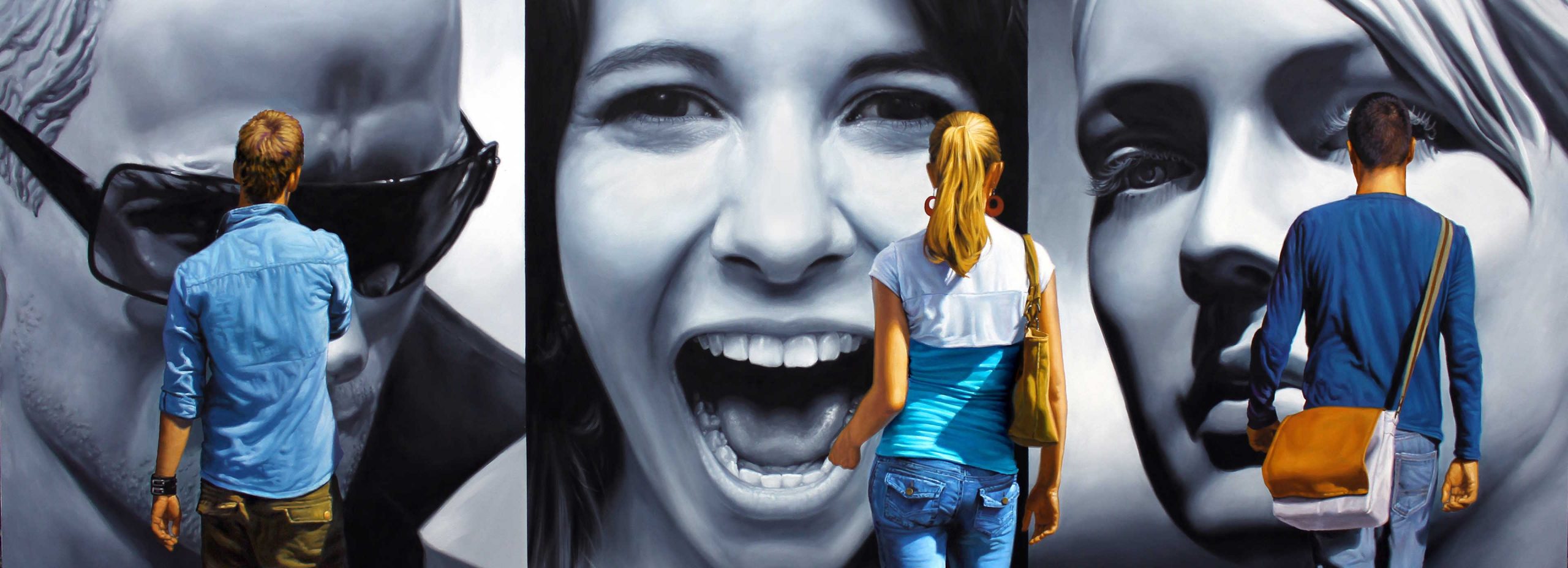 In his large-format oil paintings, Christopher Corso creates a painterly topography of the present in which visual fragments of the mass media, advertising images and urban architecture enter into tense relationships with existential pictorial figures. His compositions appear like collage-like sections of a mental city panorama – cross-fades of perception, memory and permanent media noise. The pictorial space always remains permeable: The expression oscillates between figuration and dissolution, between concrete body and symbolic void. The protagonists of his works – often isolated, distant, contoured, but not anchored in any scene – are projection surfaces of social alienation.